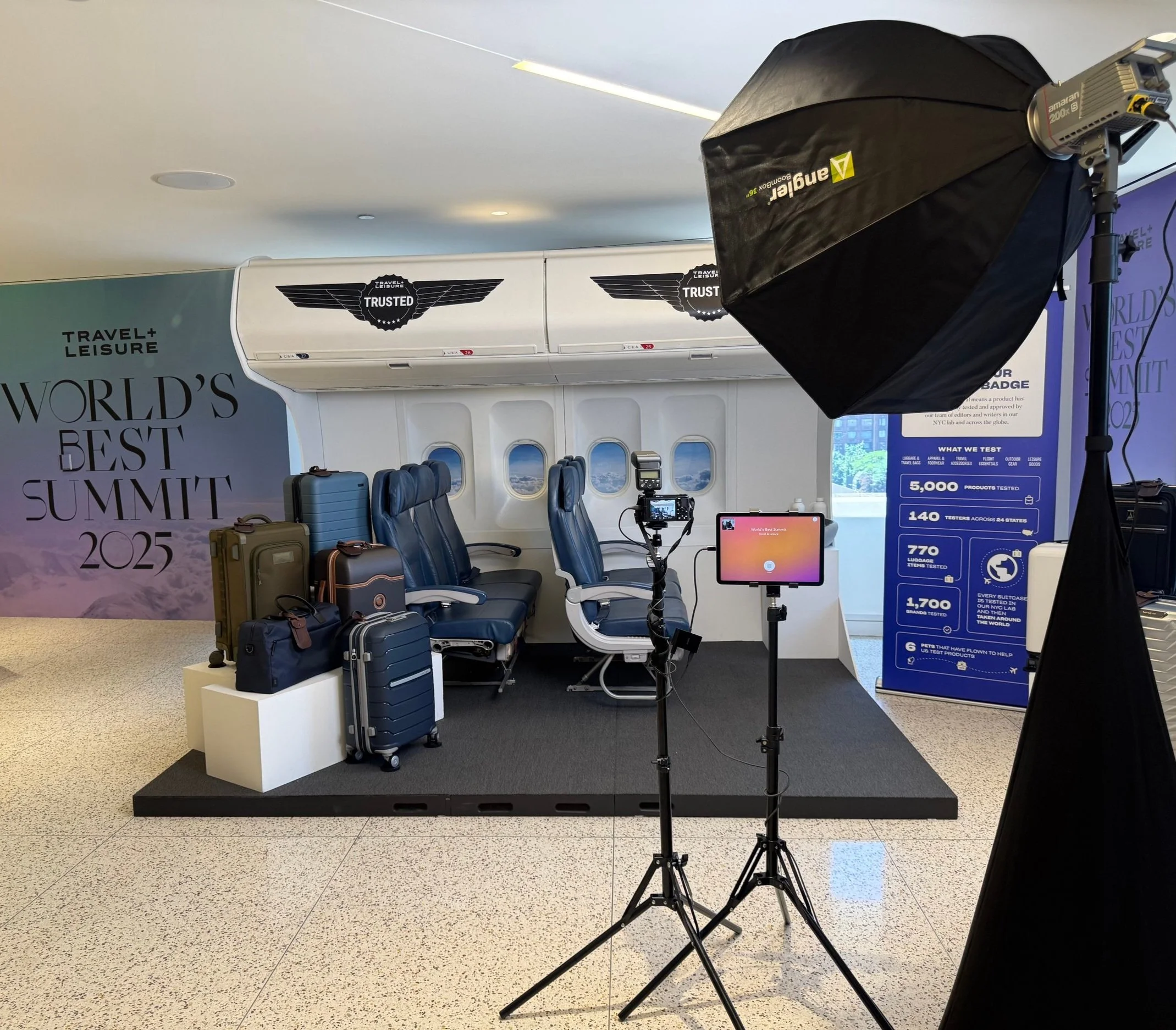 Travel + Leisure’s commerce team found Rent My Booth after searching on across Google and ChatGPT. They weren’t looking for a typical self-run booth. They needed a professional who could photograph guests in a custom-built airplane set that they use to test travel gear, capture editorial photography, and create social content. The request required more than great lighting. They needed a partner who could create a full guest experience that elevated the event and supported the brand’s storytelling goals.
